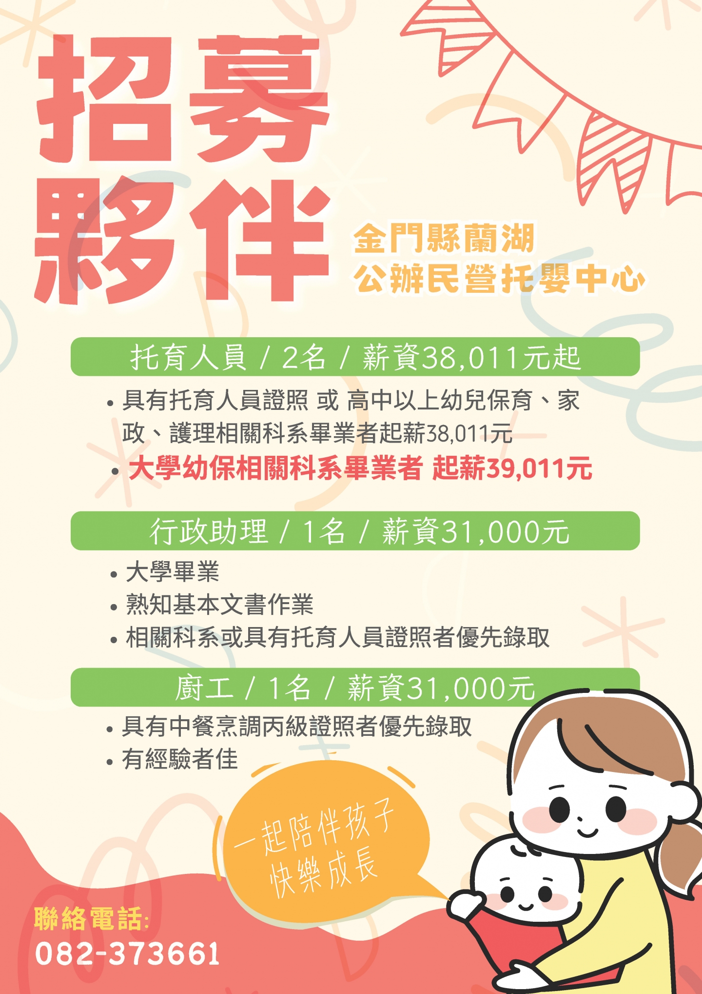 我們是金門在地深耕的托育協會,成立於民國102年,由一群熱愛托育工作的專業人員組成。多年來,我們承接多項政府托育案,累積豐富的實務經驗。我們的托育人員皆具備專業資格,以最細心、最溫暖的照顧,陪伴孩子快樂成長。